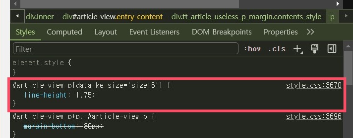 이후 개발자검사 창 중간 아래를 보면 위처럼 # article-view p...로 시작하는 클래스 이름과 line-height: 1.75;라는 글자 줄 높이 속성이 나온다. 이제 이 숫자를 변경하면 기본 글자 줄 높이를 변경할 수 있다.