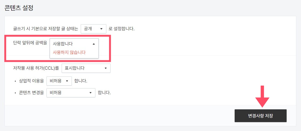 티스토리 로그인 - 블로그 관리 화면 왼쪽 메뉴 중 - [콘텐츠] - [설정]으로 오면 단락 앞뒤 공백 설정 옵션이 있다. 만약 '사용합니다'로 되어있었다면 '사용하지 않습니다'로 변경해야 본문에서 그냥 엔터 키를 입력해도 줄과 줄 여백이 넓게 나오지 않는다.