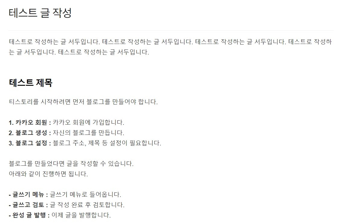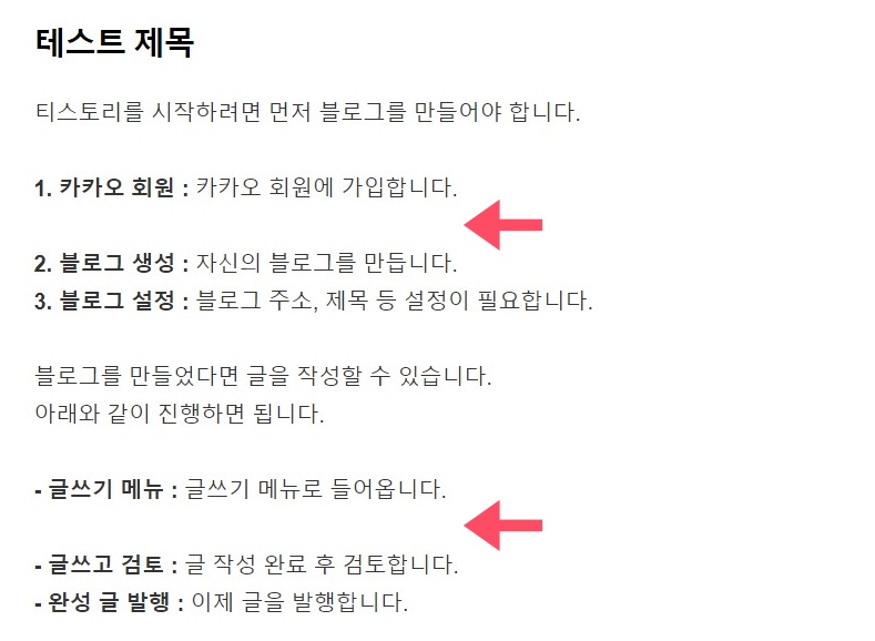 위 예시 글에서 '1. 카카오 회원'과 '2. 블로그 생성' / '글쓰기 메뉴'와 '글쓰고 검토' 사이에 여백이 생긴 것을 알 수 있다. 이건 실수로 그렇게 여백을 줘서 그런 경우도 있겠지만, 여백을 준 적이 없는데 이렇게 나올 때가 있을 것이다.