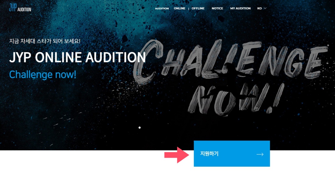 JYP 공식 오디션 홈페이지에 접속하면 메인 화면에서 해당 정보를 볼 수 있다. [지원하기] 버튼을 클릭하면 바로 지원 페이지로 이동하는데 그전에 지원분야도 확인해 보자.