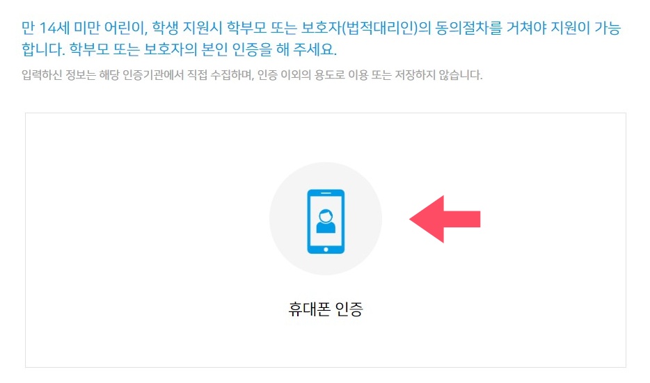 내국인은 만 14세 이상/미만 선택할 수 있는데, 만 14세 미만 지원자는 법적 대리인(학부모나 보호자)의 동의 절차와 법적 대리인 본인 인증이 필요하다.