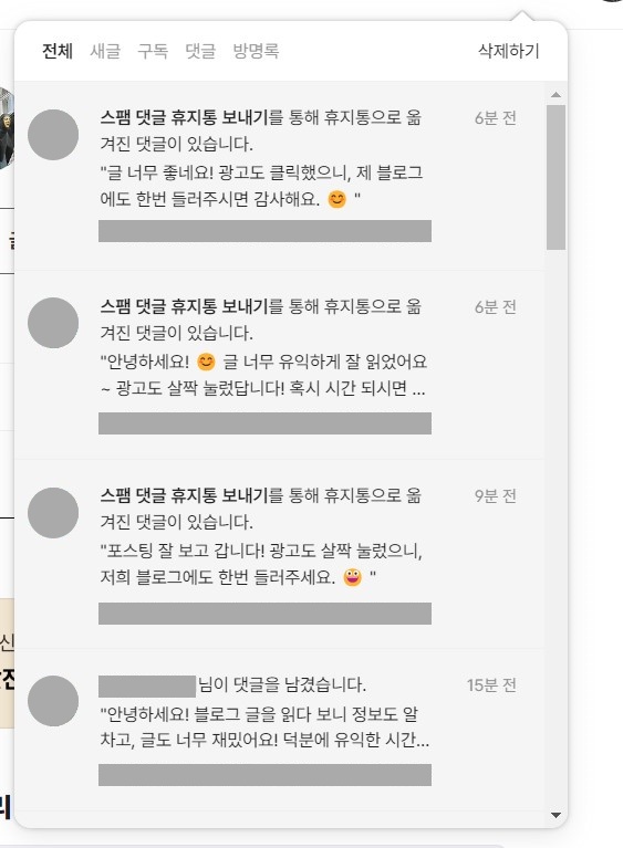 여기 이름과 프로필 사진을 가린 이 사람도 보자. 요즘 매크로 댓글을 활발하게 남기는 사람인데 몇 분 단위로 로봇이 블로그에 방문해서 아무 글에나 댓글을 써서 자신의 블로그 방문과 광고 클릭을 유도하고 있다. 블로그 초보자라면 혹 하는 마음이 들 수 있는데 모두 매크로 댓글인 점에 주의할 필요가 있다.