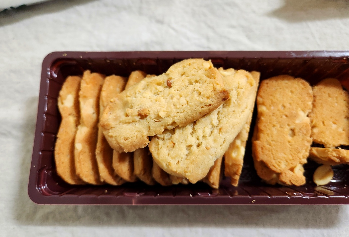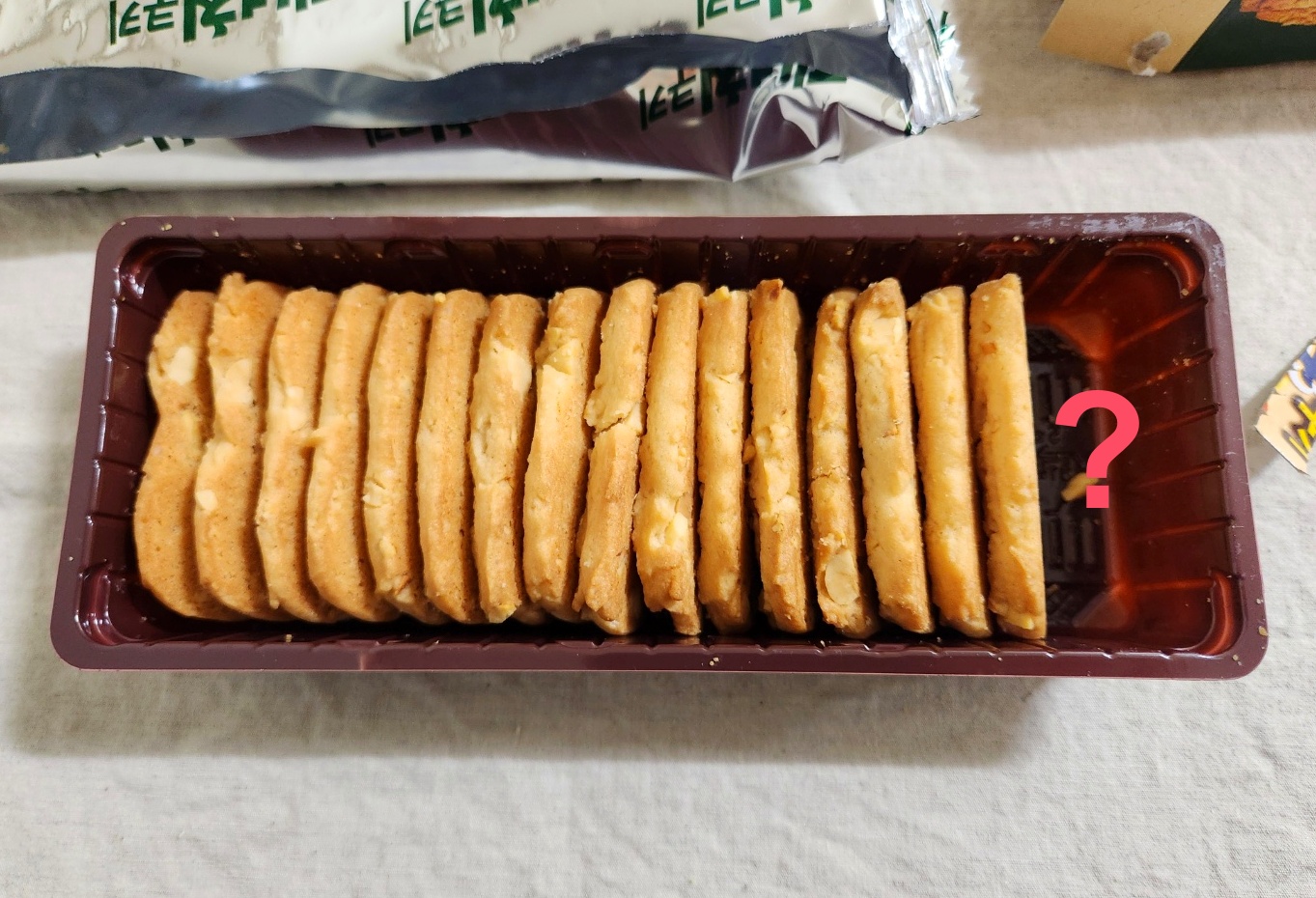 포장 상자와 비닐을 벗기면 갈색 트레이 안에 과자가 담겨 있는데 일부 과자가 부서져 있었다. 이걸 조립해서 나란히 정렬시켜 보니 트레이에 2~3개 정도가 더 들어갈 공간이 있어서 조금 당혹스러웠다 ㅎ 뭐지; 결론은 쿠키는 16개 들어있다고 보면 되겠다.